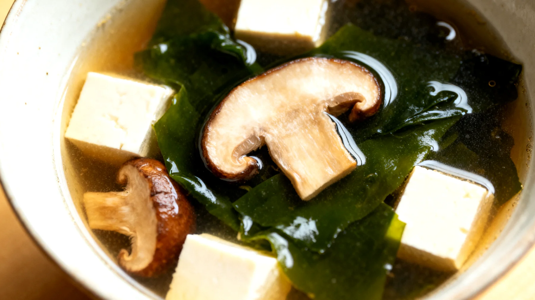 Die Stärke der Miso-Suppe liegt in ihrer durchdachten Zusammensetzung. Seidentofu liefert hochwertige pflanzliche Proteine mit allen essentiellen Aminosäuren, vergleichbar mit tierischen Quellen, aber deutlich leichter verdaulich. Die fermentierte Miso-Paste bringt probiotische Kulturen mit, die die Darmflora aktiv unterstützen – besonders wertvoll für Menschen, deren Mikrobiom durch wechselnde Essenszeiten aus dem Gleichgewicht geraten ist. Wakame-Algen ergänzen das Ganze mit Jod, Calcium, Magnesium und präbiotischen Ballaststoffen. Shiitake enthalten Beta-Glucane, komplexe Polysaccharide, die das Immunsystem modulieren können – eine willkommene Unterstützung für alle, deren Immunabwehr durch gestörte Schlafrhythmen geschwächt ist.